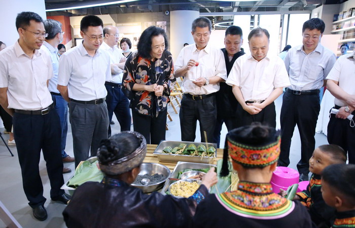 活动中,自治区博物馆党委书记吴伟峰现场带来了“广西的味道”——非物质文化遗产知识讲座,介绍了端午节的由来、民间习俗以及广西本地传承的特色非遗美食。随后,现场展示的广西非物质文化遗产——六堡茶茶艺和隆林非遗文化技艺——黑米粽子制作等精彩内容将活动推向高潮。正当大家对手工制作的黑米粽子跃跃欲试时,由隆林当地厨师使用隆林当地原生态食材精心打造的特色美食已被端上桌来,隆林县的群众希望通过这种质朴又简单的方式,在端午佳节到来之际,向共同帮扶隆林的中直和区直单位表示感谢。
