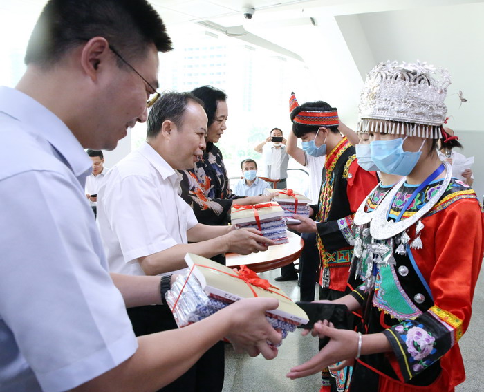 王西翼秘书长、张虹局长和韩流副部长为广西广播电视学校隆林学子学生代表赠送书籍