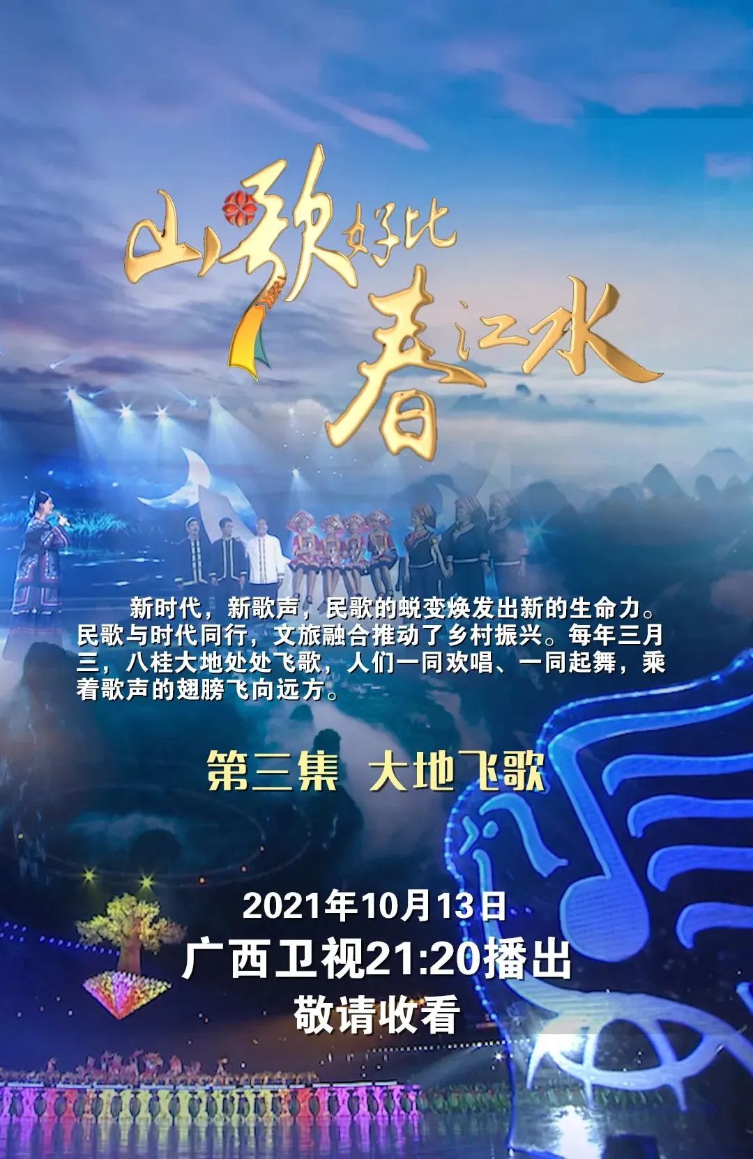 第三集《大地飞歌》着重展现以国际民歌节和三月三歌节为代表,广西民歌在当代如何以更具有国际化、年轻化的形象登上艺术殿堂、走向世界。呈现了广西传统民歌通过自有的生命力不断衍生,在以产业的形式适应当代经济浪潮的发展的同时,又通过产业化的反哺实现传承,并为广西的文旅发展、乡村振兴带来生机。(单集回顾→恰是百年风华·放映馆 |第三十六期(增刊)《山歌好比春江水》第三集《大地飞歌》)