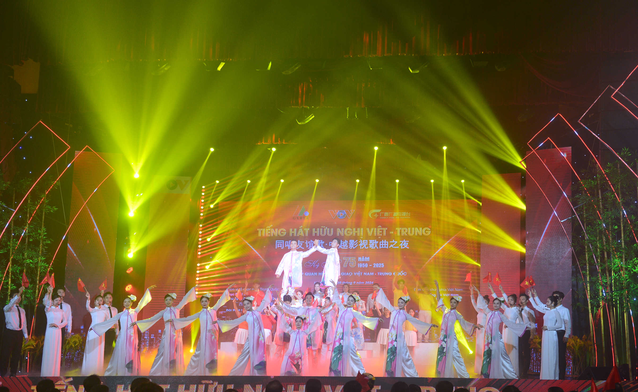 9月30日,第六届中国—东盟视听周系列活动之一,“同唱友谊歌·中越影视歌曲之夜”活动在越南河内举行,为2025年中越建交75周年和“中越人文交流年”营造良好氛围。越共中央委员、越南之声广播电台台长杜进士,越共中央宣教部副部长潘春水,越南外交部副部长范青平,中国驻越南大使馆公使王群,以及中越各界青年代表近400人参加活动。