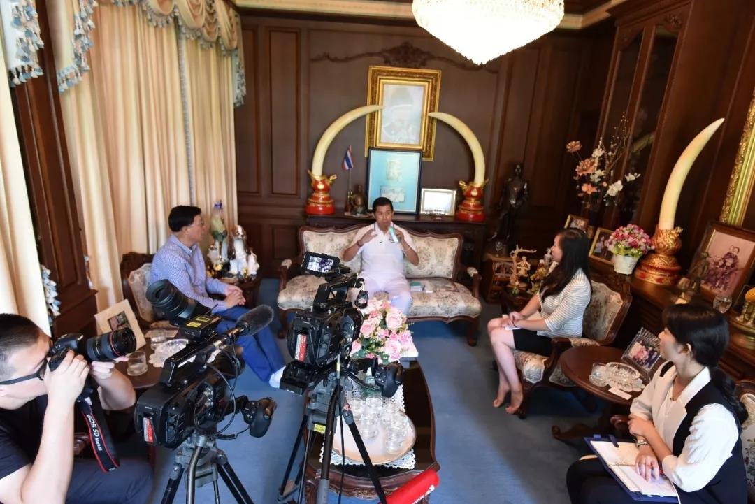 2016年7月22日,南宁电视台记者在泰国曼谷采访泰中友协会长,泰国前副总理功·塔帕朗西