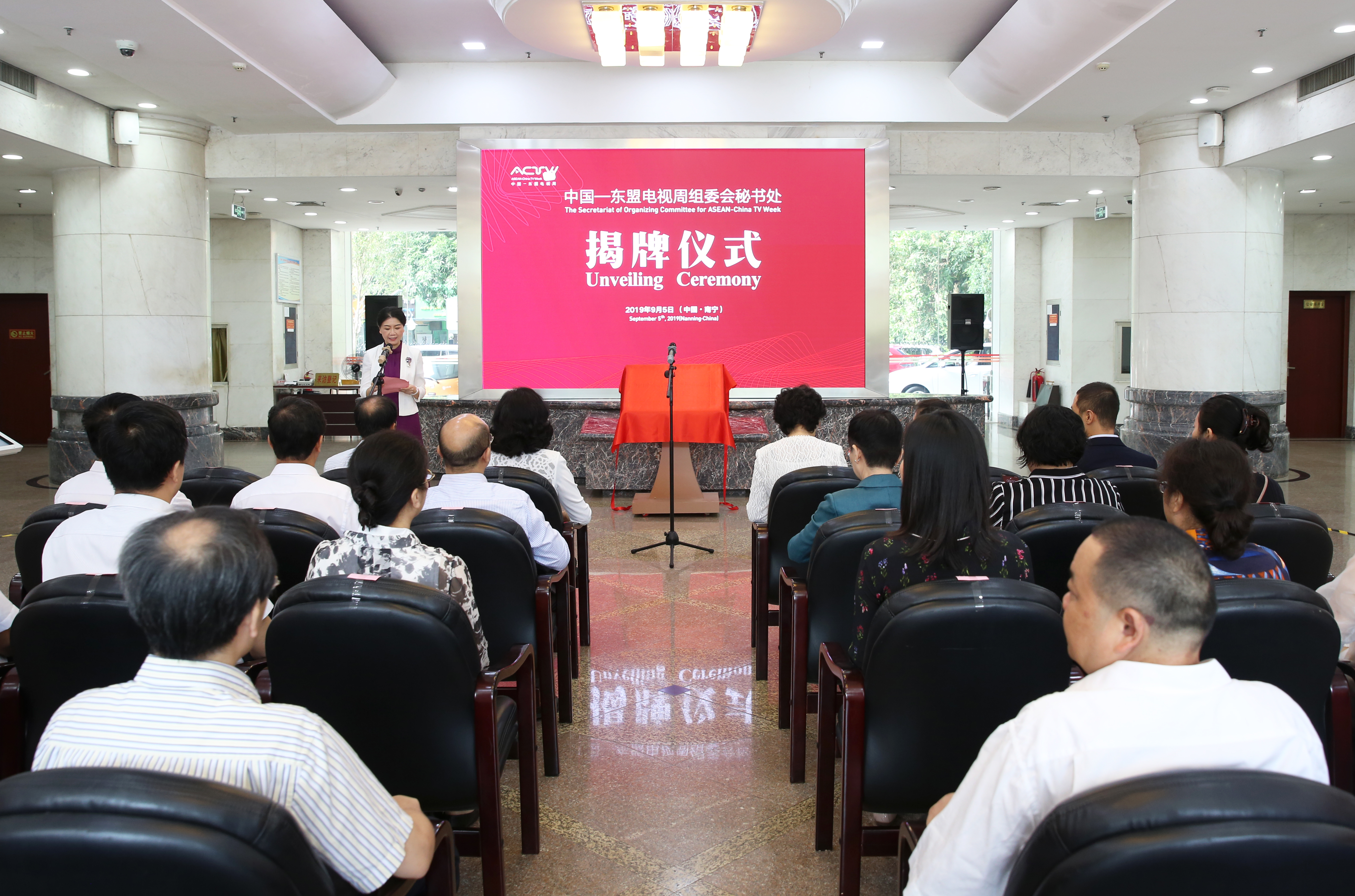 党组书记、局长张虹共同为中国—东盟电视周组委会秘书处揭牌。局党组成员、副局长朱日荣、吴晓丽、李承武,局副巡视员李晓泉、李庆楠,广西广播电视台副总编辑郑葵,广西广电网络公司副总经理陈远程等领导嘉宾出席揭牌仪式。仪式由吴晓丽副局长主持。