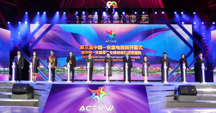 10月27日晚,由国家广播电视总局、老挝新闻文化旅游部、自治区人民政府主办的第三届中国—东盟电视周开幕式暨中国—东盟青年主播创造营结营盛典在南宁举行。中宣部副部长、国家广播电视总局局长聂辰席,老挝新闻文化旅游部副部长温吞·考潘,中国驻东盟使团大使邓锡军,印尼通讯与信息技术部部长约翰尼·杰拉得·布拉特,缅甸宣传部部长吴貌貌翁作视频致辞。自治区党委常委、宣传部部长范晓莉出席和致辞,并与参会嘉宾共同按下启动柱。东盟有关国家驻华使馆和驻南宁总领事馆官员、国家广播电视总局所属机构和部分省(区、市)广电部门负责人,以及传媒领域专家代表等400余人出席。
